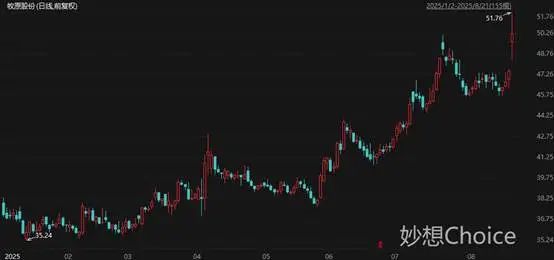 二级市场上,8月21日,牧原股份股价盘中触及51.76元,创出4年以来新高;截至收盘报50.21元,涨幅达到5.71%,总市值逼近2800亿元,年内累计涨幅32.6%。