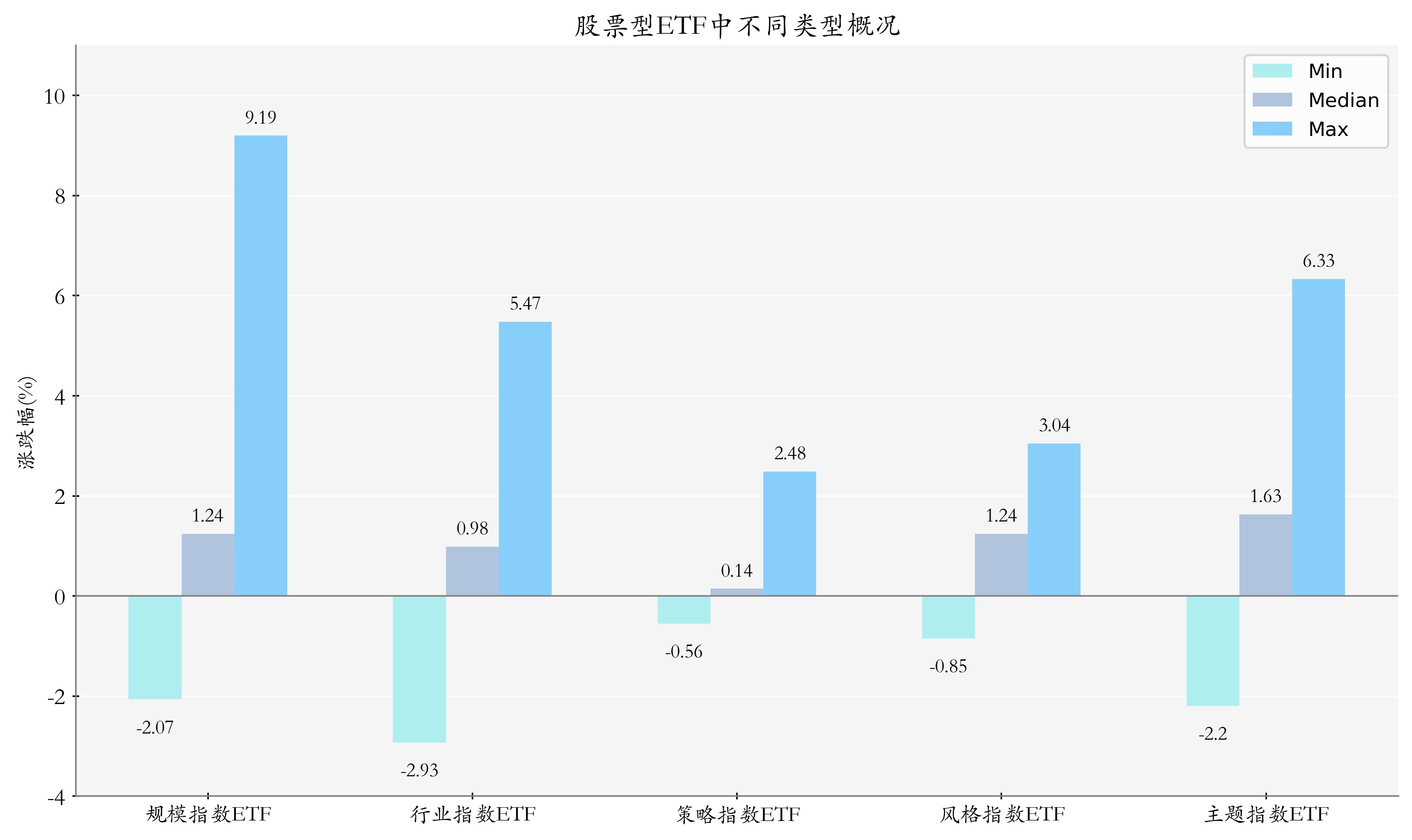 昨日股票型ETF收益率中位数为1.27%。其中按照不同分类,规模指数ETF中汇添富中证500增强策略ETF收益率最高,为9.19%;行业指数ETF中华宝中证800地产ETF收益率最高,为5.47%;策略指数ETF中华夏中证红利低波动ETF收益率最高,为2.48%;风格指数ETF中万家上证科创板成长ETF收益率最高,为3.04%;主题指数ETF中嘉实中证高端装备细分50ETF收益率最高,为6.33%。