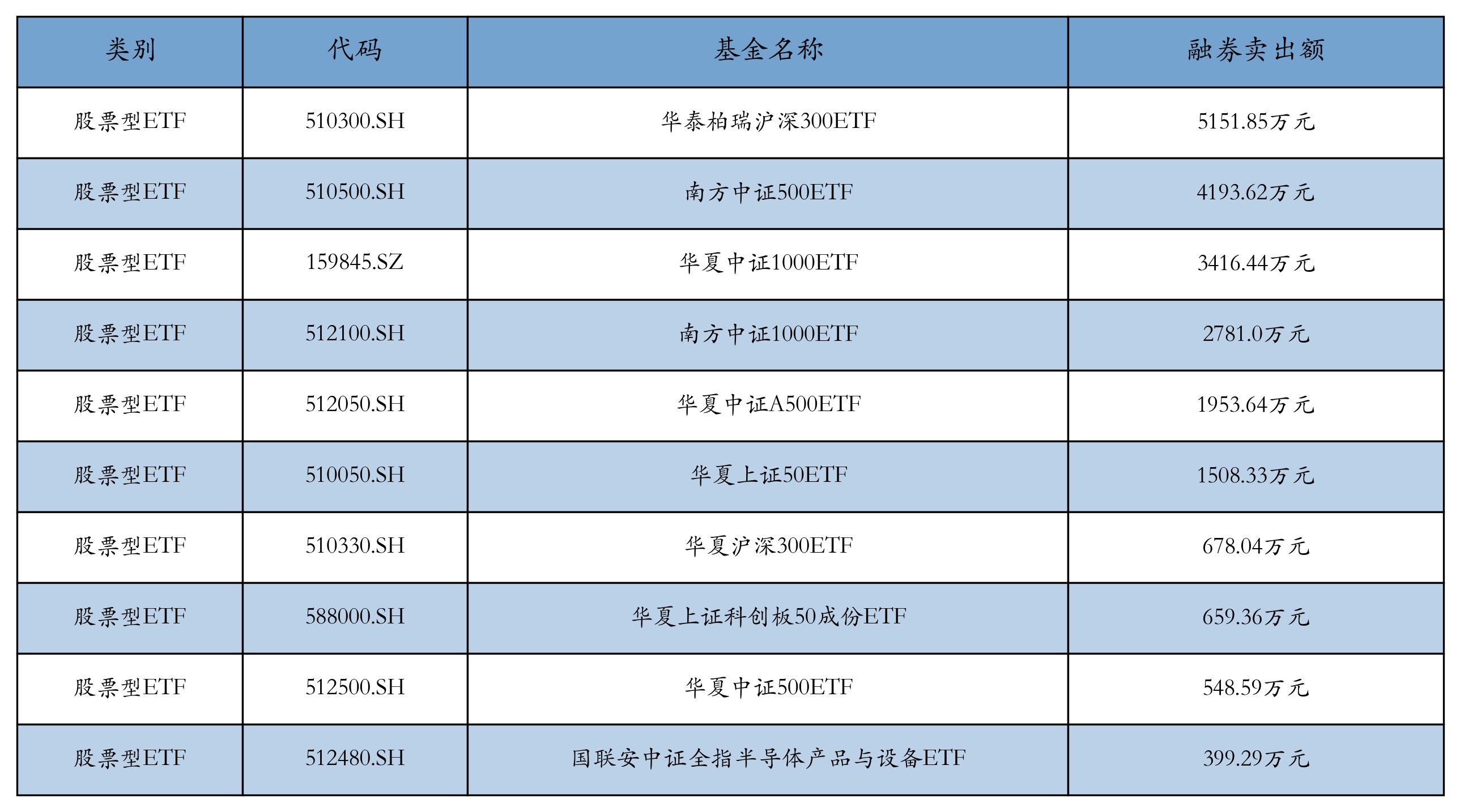 昨日股票型ETF融资卖出额最高的3支ETF及其卖出金额分别为:华泰柏瑞沪深300ETF(5151.85万元)、南方中证500ETF(4193.62万元)、华夏中证1000ETF(3416.44万元)。融券卖出额前10详情见下表: