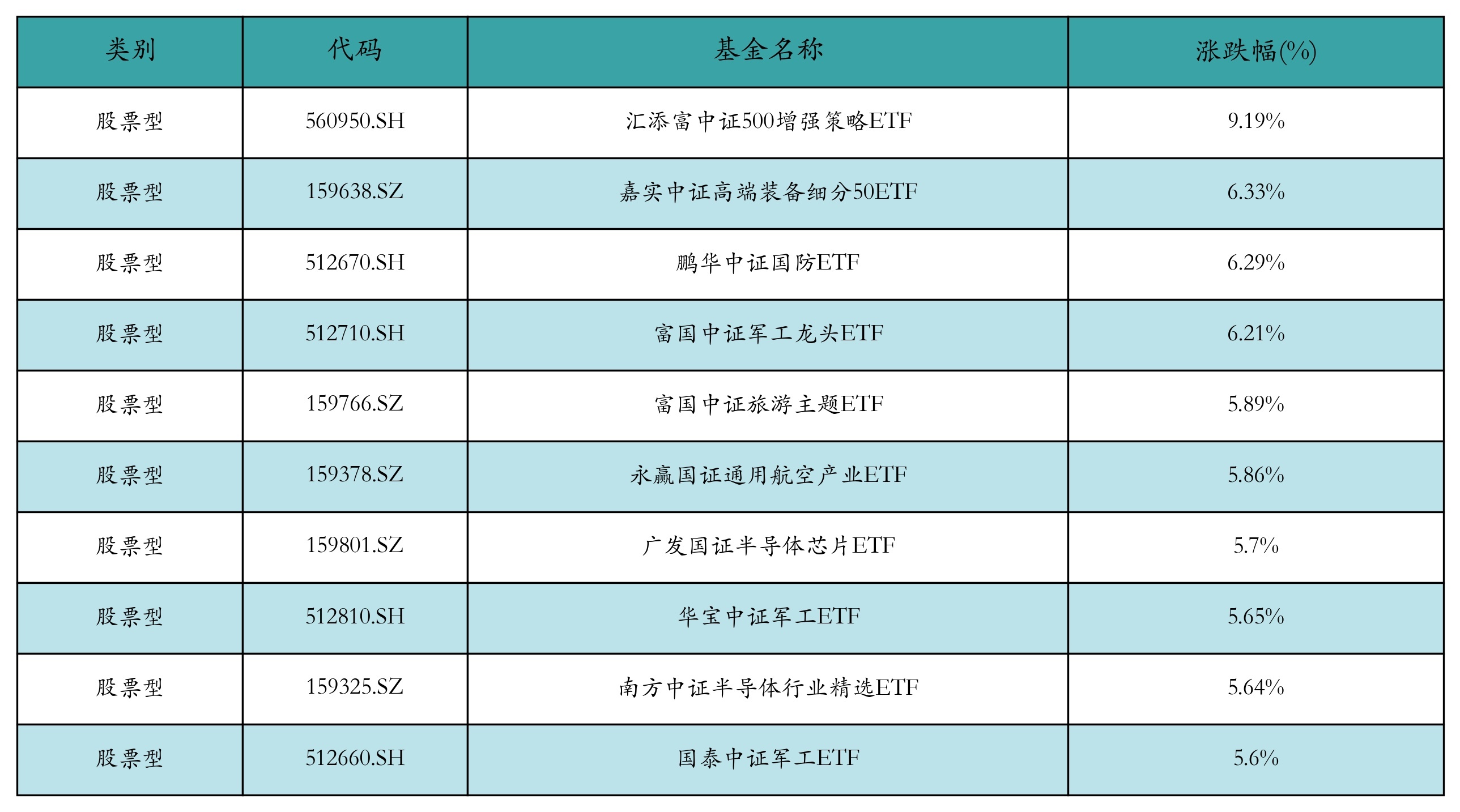 昨日股票型ETF涨幅最高的3支ETF及其收益率分别为:汇添富中证500增强策略ETF(9.19%)、嘉实中证高端装备细分50ETF(6.33%)、鹏华中证国防ETF(6.29%)。涨幅前10详情见下表: