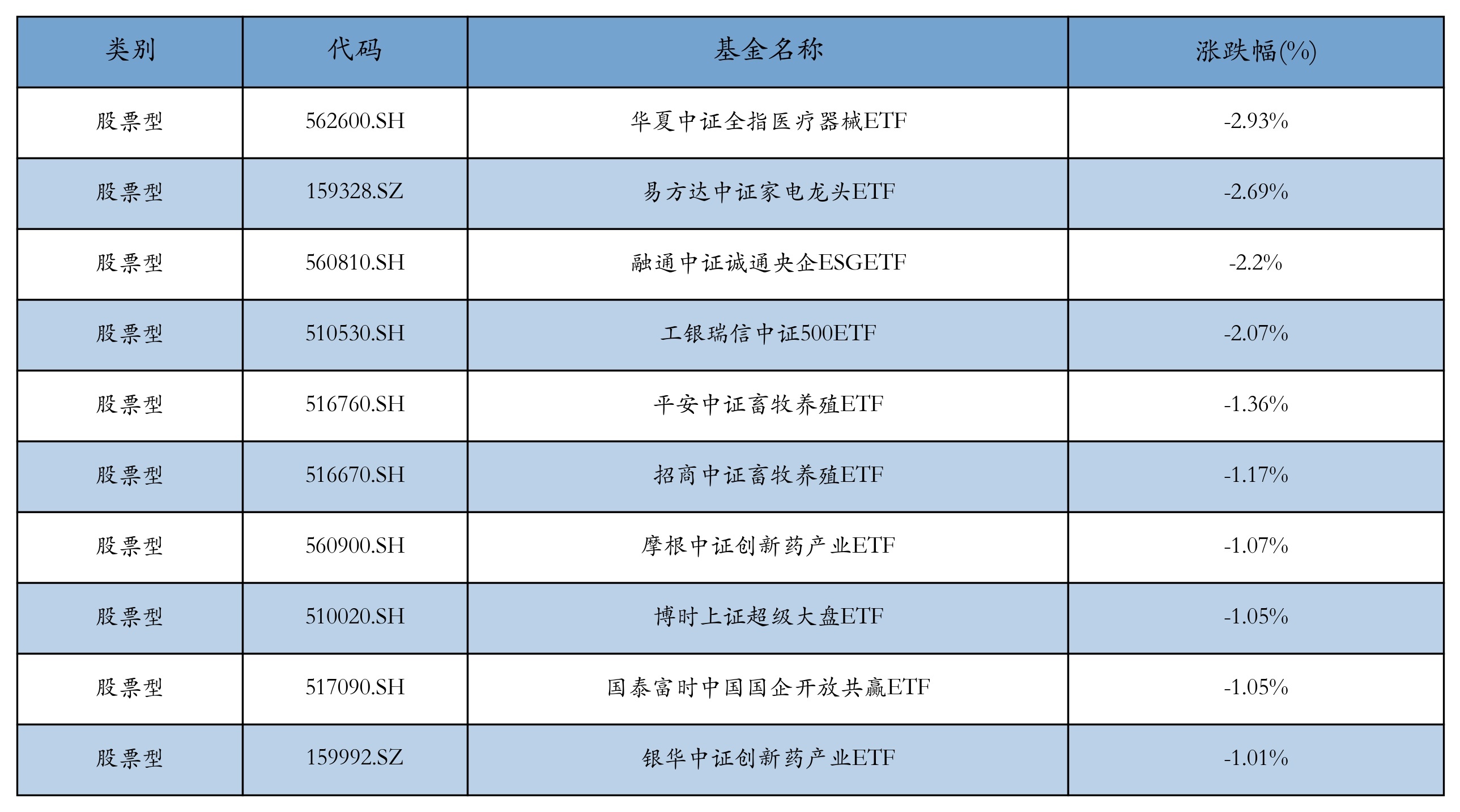 昨日股票型ETF跌幅最大的3支ETF及其收益率分别为:华夏中证全指医疗器械ETF(-2.93%)、易方达中证家电龙头ETF(-2.69%)、融通中证诚通央企ESGETF(-2.2%)。跌幅前10详情见下表:
