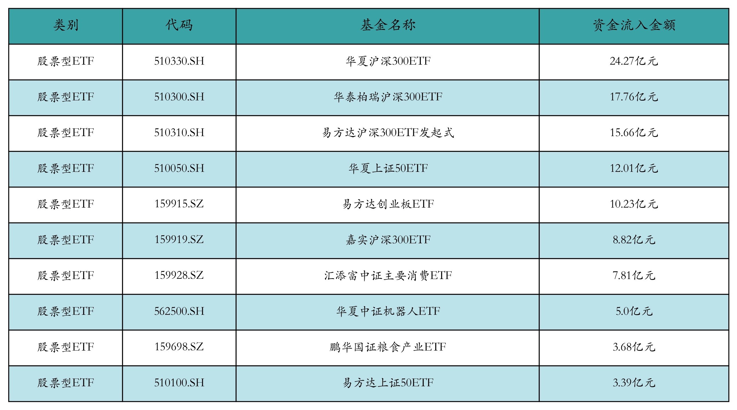 昨日股票型ETF资金流入最多的3支ETF及其流入金额分别为:华夏沪深300ETF(流入24.27亿元)、华泰柏瑞沪深300ETF(流入17.76亿元)、易方达沪深300ETF发起式(流入15.66亿元)。资金流入前10详情见下表: