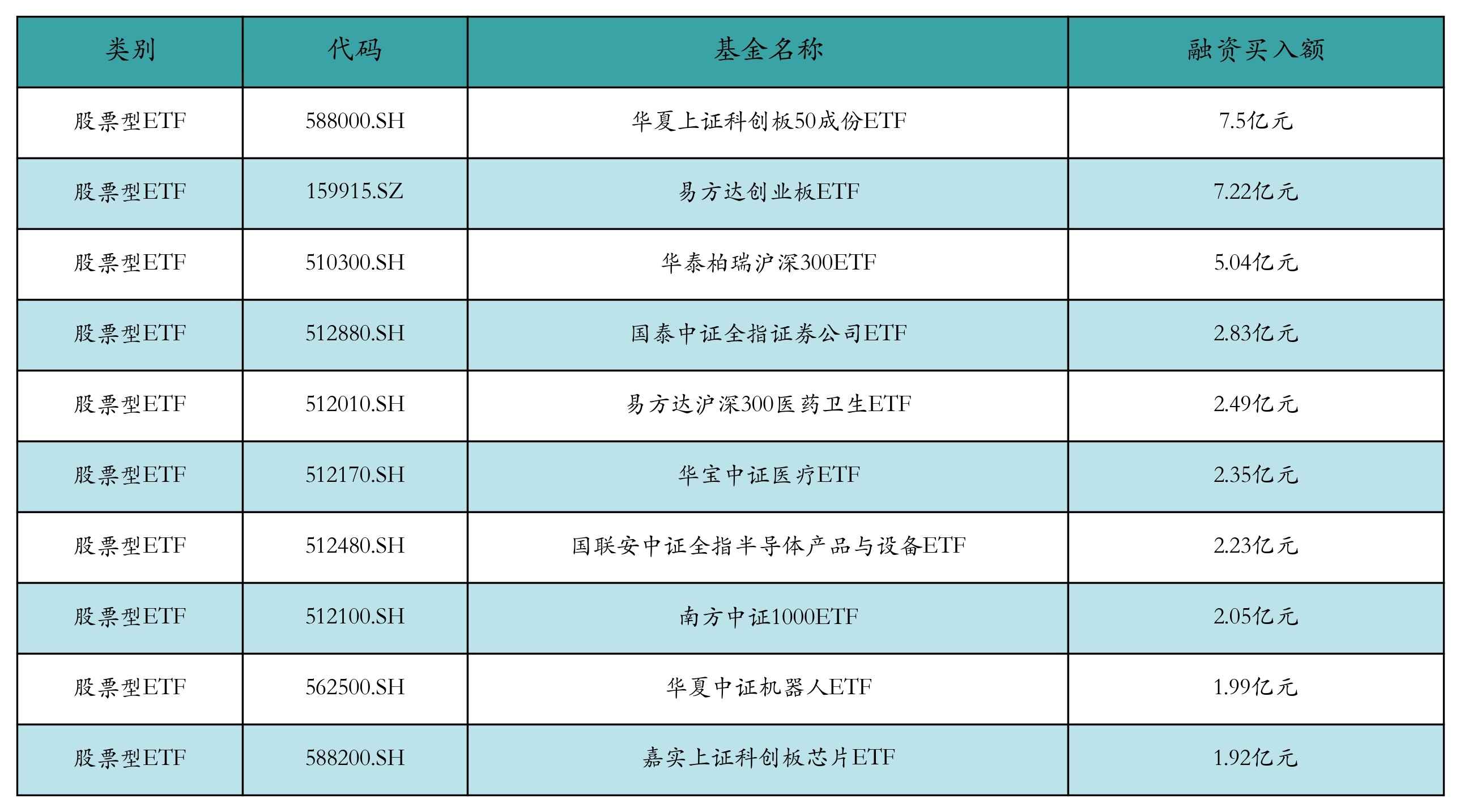 昨日股票型ETF融资买入额最高的3支ETF及其买入金额分别为:华夏上证科创板50成份ETF(7.5亿元)、易方达创业板ETF(7.22亿元)、华泰柏瑞沪深300ETF(5.04亿元)。融资买入额前10详情见下表: