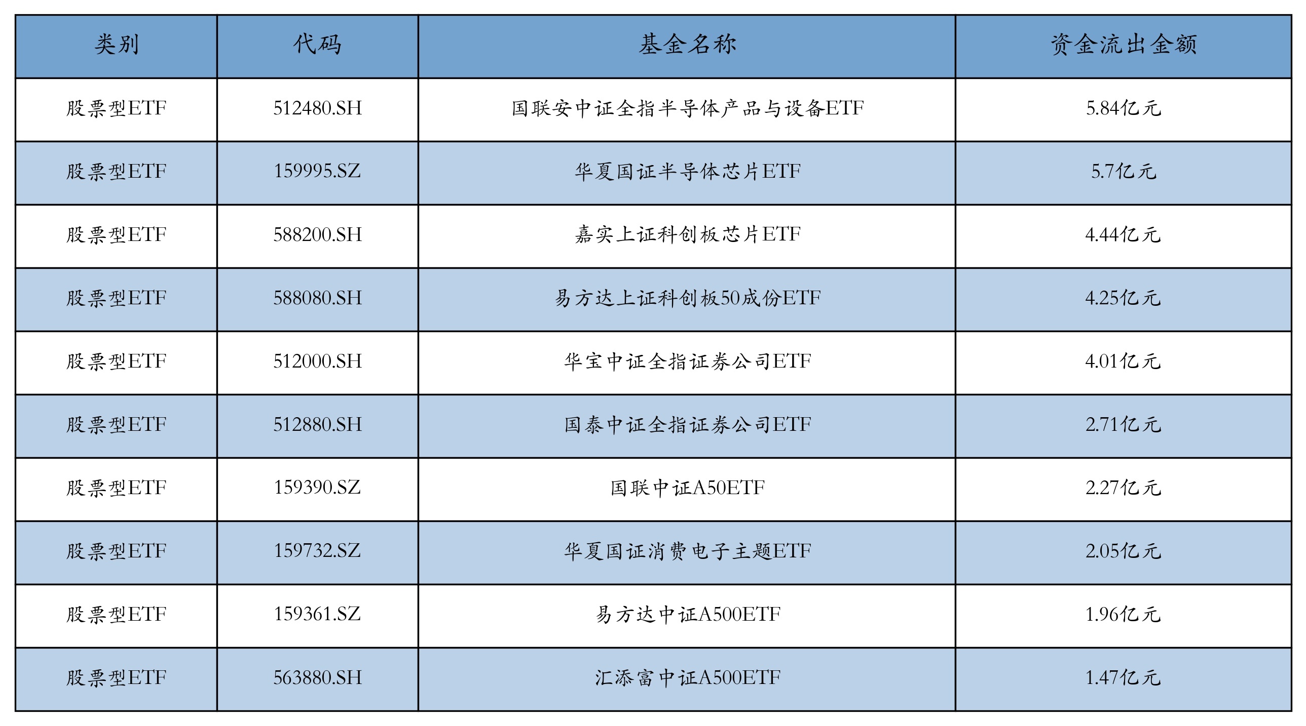 昨日股票型ETF资金流出最多的3支ETF及其流出金额分别为:国联安中证全指半导体产品与设备ETF(流出5.84亿元)、华夏国证半导体芯片ETF(流出5.7亿元)、嘉实上证科创板芯片ETF(流出4.44亿元)。资金流出前10详情见下表: